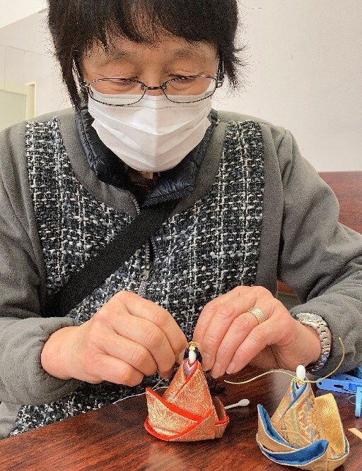 綿棒を人形の顔や身体の軸として用い、5枚の色の異なる布や華やかな帯を重ねた。十二単(ひとえ)の襟元はそれぞれの布が見えるように少しずつずらしながら重ね、髪の毛には糸、扇子は絵柄の付いた紙をじゃばらに折るなど参加者は指先の細かな作業に没頭。縦9センチ、横7センチの手乗りサイズのかわいらしい人形に仕上げた。