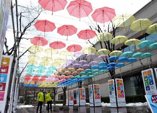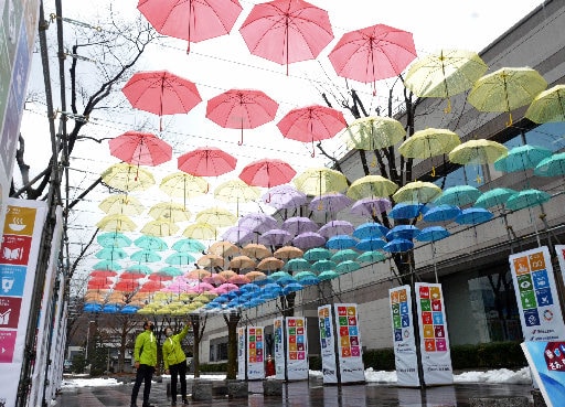 長さ18メートル、幅9メートルにわたり、赤や青、黄色などカラフルな計162本の傘がワイヤロープでつるされ、まるで空に咲く花のよう。傘にはSDGsの17の目標を示すロゴも描かれている。