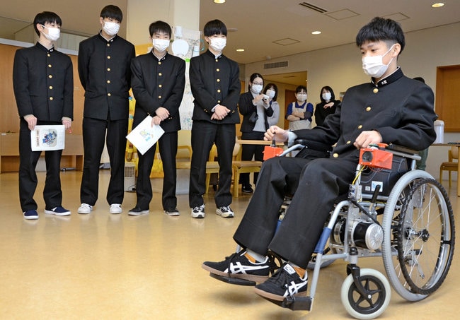 車いすは学校で保管し、利用希望があれば貸し出すという。施設職員10人の前で操作し、出来栄えを披露した吉田圭佑さん(18)は「センサーなどいろいろな機能を活用して外出を楽しんでもらえたらうれしい」と話した。