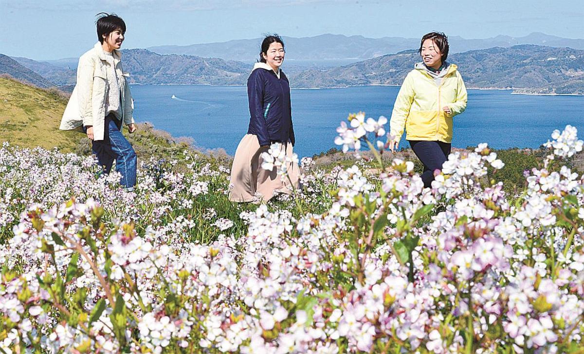 友人と訪れた村の集落支援員、塚本萌乃さん(25)は「島に春を呼ぶすてきな風景です」と話した。(森山郷雄)