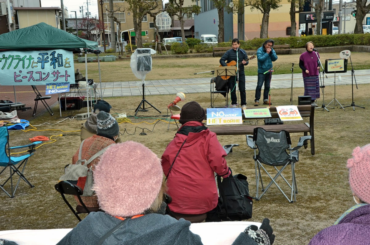 ロシアによるウクライナへの軍事侵攻に反対の声を上げようと、鳥取県内で活動するミュージシャン仲間が6日、米子市内で緊急の野外コンサートを開き、反戦の歌声を響かせた。