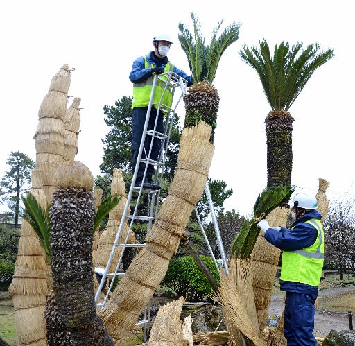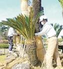 公園の指定管理者、YONAGOパブリックパーク・パートナーズ共同事業体(米子市二本木)の作業員4人が脚立に上がり、最大高さ3・5メートルのソテツから剪定(せんてい)ばさみで縄を切り、手際良くこもを取り外した。