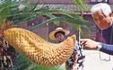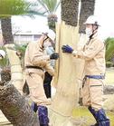 米子市西町の湊山公園で14日、園内に植えられた樹齢約360~370年のソテツ5株のこも外しがあった。冬を越し、青々とした葉が現れ、春の訪れを告げた。