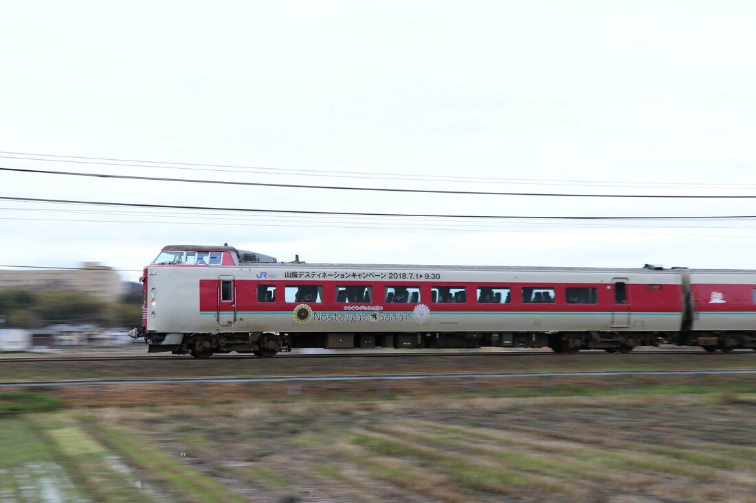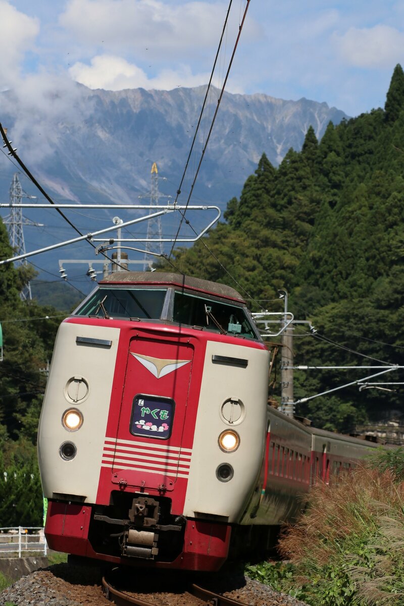 特急やくものキハ181系の車体は、クリーム色地に赤い羽型のラインが入った「国鉄色」と呼ばれるデザインのディーゼル車。JR西日本によると、やくもの名称の由来は島根県東部の旧国名、出雲の枕ことばの「八雲立つ」にちなむという。