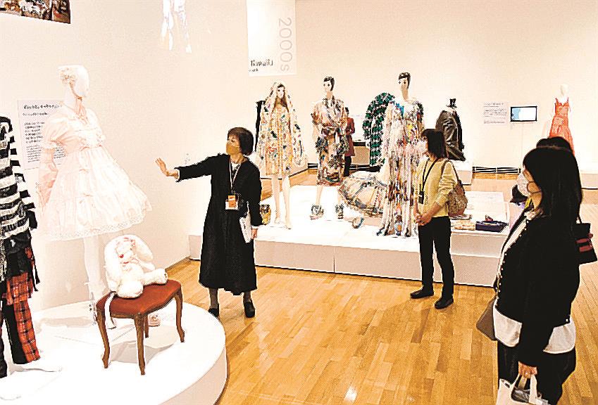 【益田】益田市有明町の島根県立石見美術館で開催中の企画展「ファッション イン ジャパン 1945―2020」(山陰中央新報社など主催)の担当学芸員が作品解説をするギャラリートークが11日、同館であり、参加者10人が流行を生んだ時代背景について説明を聞きながら鑑賞した。