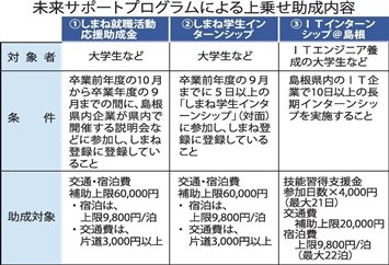 上乗せするのは、県が実施している(1)就職活動(2)インターンシップ(就業体験)(3)IT技能習得-の3制度。県がそれぞれ上限額を設け、交通費、宿泊費を半額助成している。4月1日からは、山陰中央新報社が展開する「未来サポートプログラム」から同じ基準で同額を支援することで、全額補助を実現する。