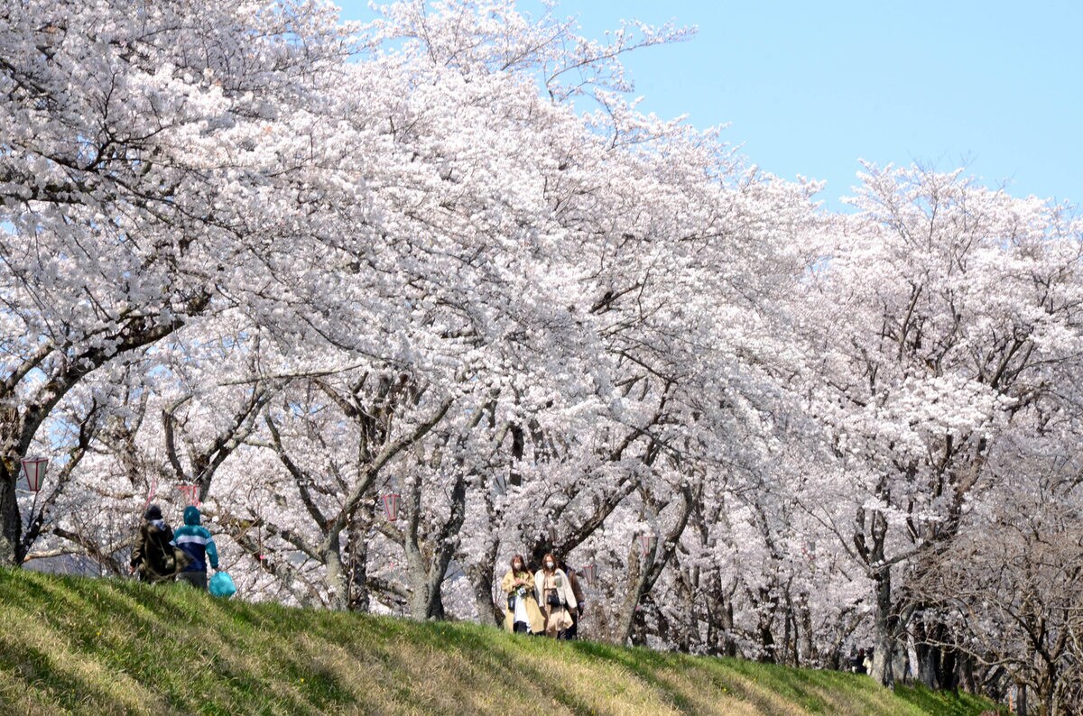 町企画政策課によると、例年よりもやや遅い3月27日に咲き始め、1日に満開になった。3日は、新型コロナウイルス感染拡大のため中止されていた「さくらまつり」が3年ぶりに開かれ、多くの花見客でにぎわった。