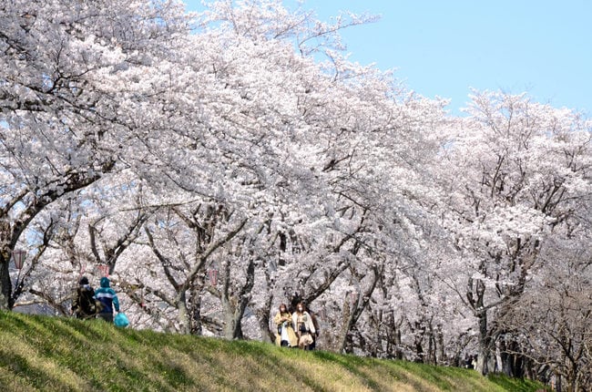5・3キロにわたる鳥取県南部町の法勝寺川土手の桜が満開となっている。約400本が咲き誇り、訪れた人がスマートフォンで記念写真を撮りながら思い思いに散歩を楽しんでいる。