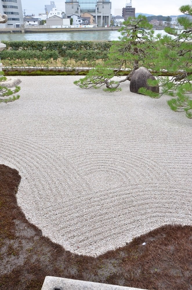 白砂には宍道湖のさざ波をイメージした砂紋が描かれる。波を表現するため、生け垣を3段の高さにするなど、借景を生かす工夫がされている。白砂には飛び石や石畳が敷かれ、石畳の回りにスギゴケでつくった築山が庭園の平面部分を強調し、遠近感を生み出す。ランキングの他の庭園と比べると、庭園としての規模は小さいが、湖と調和した素朴な庭園づくりが評価されている。
