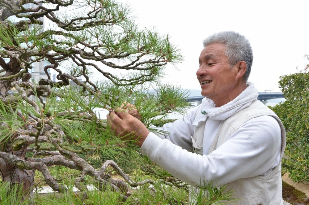 中本さんは同館の庭を初めて見た時、庭園の完成された空間美に感動したという。「庭師としてあれこれ手を加えるより、庭本来の良さを変えないことを一番心掛けている」と話し、落ち葉拾いや除草といった清掃に時間を掛ける。せん定の際には自分のイメージを押し付けるのではなく、枝葉の中で目立つ部分を整える程度でいるという。庭園が広すぎない分、より丁寧に手入れをできるのも強みだ。