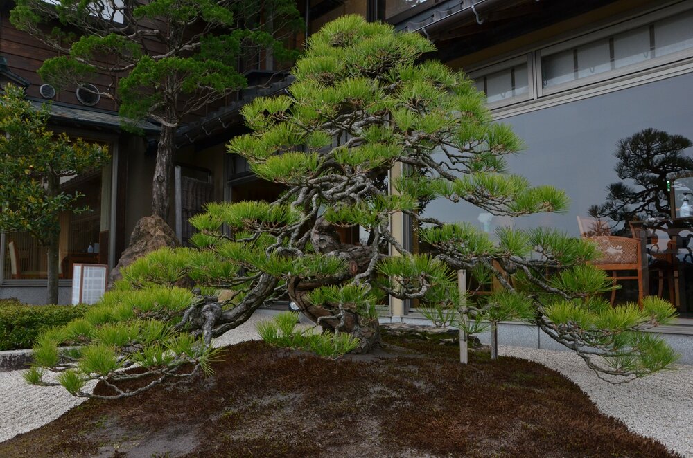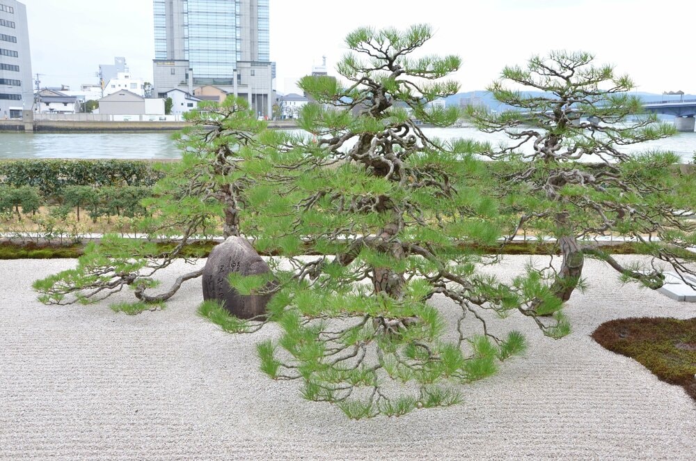 広さ900平方メートル(幅45メートル、奥行き20メートル)の庭園に入ると、白砂青松の形式で、白砂に映えるマツ計15本が並び、奥には宍道湖と大橋川が広がっている。同館によると入り口正面にある、並んだ黒松と赤松をそれぞれ夫と妻、そばにある小さい黒松を子に見立て、仲良く寄り添う親子の幸福な姿を表現しているという。