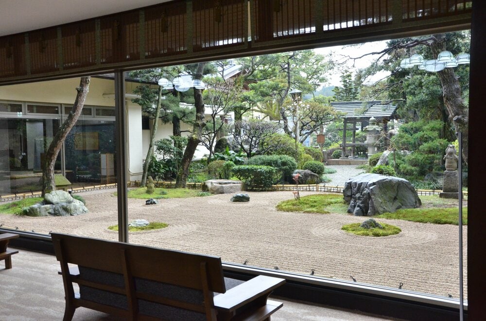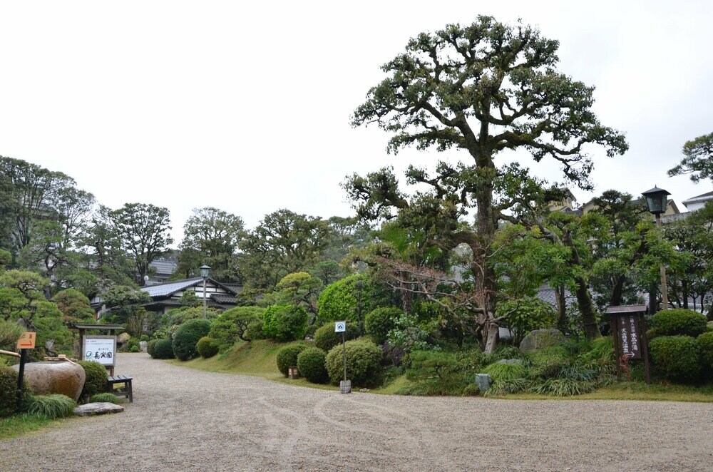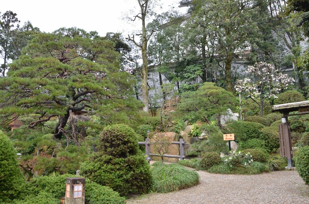 回遊式庭園の通路に敷き詰められた白い玉砂利を歩くと、通路の両側には背の高いマツを中心に、100種類2万本の木々が立ち並ぶ。温泉旅館という性質上、客室から温泉が見えないよう、木はあえて高く成長させ、せん定では葉を多く残す。玉砂利の白と樹木の濃い緑が非日常的な空間を生み出し、宿泊者が庭の中を歩くと旅をしている気分になれるよう、意図して造ったという。