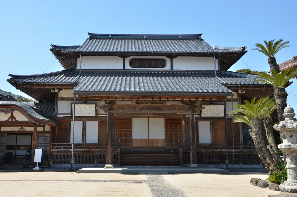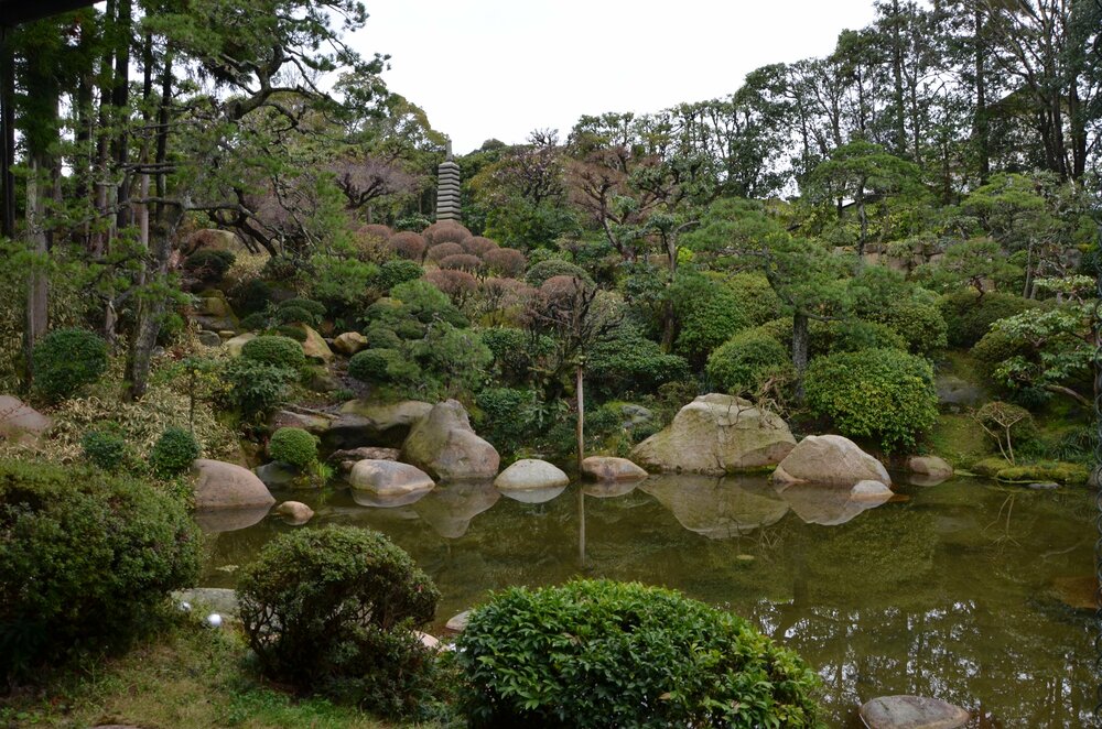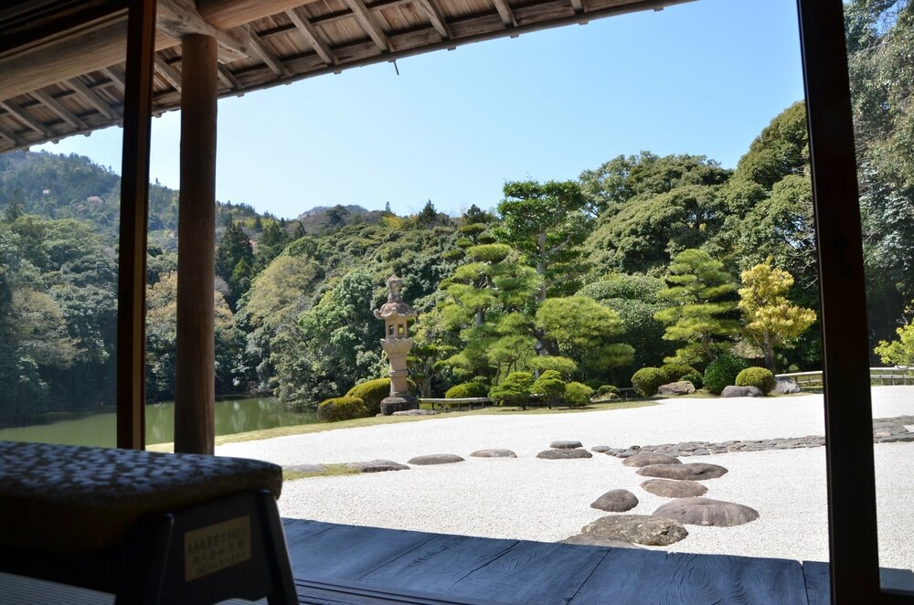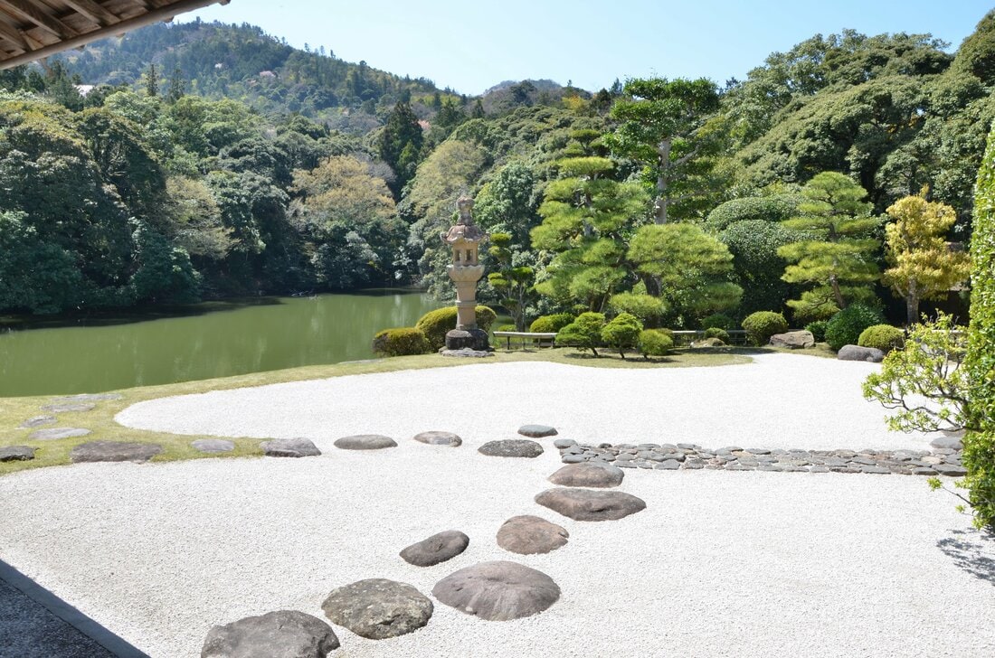 庭園は大名茶人として知られる松江藩7代藩主、松平不昧公のお抱え庭師、沢玄丹が、1830年から3年半かけて築いたと伝わる。寺の書院に入ると、縁側の先には、左手に広がる雄大な旅伏山と貯水池を借景にした、白砂の枯山水(約850平方メートル)を臨むことができる。右手にある庭園は茶道の影響を強く受けている。茶人が庭園を通って茶室へ向かうために歩く、白砂に敷かれた多数の飛び石そのものが庭園の主景になっている。