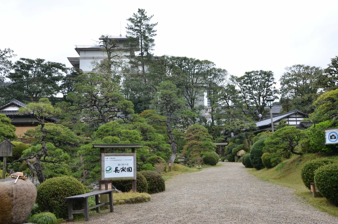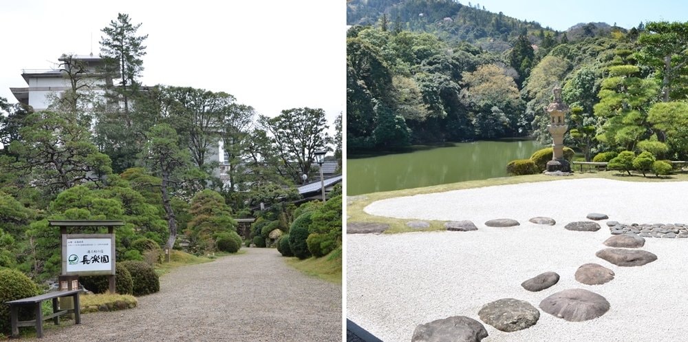 長楽園によると、庭園の広さは3万平方メートルで、建物以外の敷地はほぼ全てが庭園。旅館のロビーから見える中庭(300平方メートル)には白砂の枯山水庭園が広がり、点在する置き石の周辺に描かれた砂紋は、出雲大社本殿の天井に描かれている「八雲之図」に見立てたという。庭園の一部では出雲地方に伝わるまが玉をコケで形作った場所があり、県外からの宿泊者が出雲の歴史に思いを巡らすことができるように工夫されている。