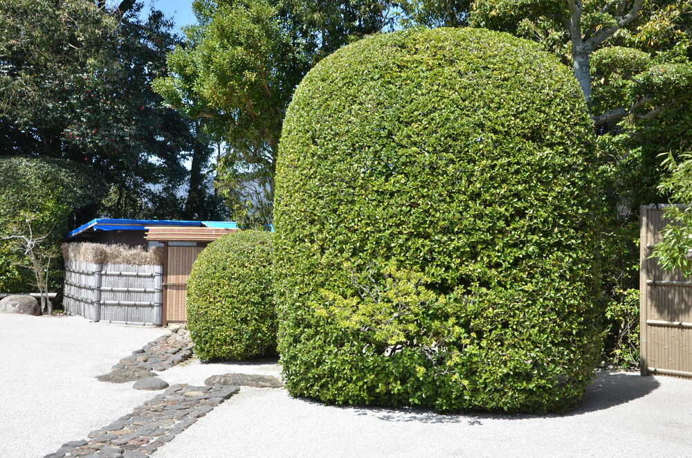 長谷川氏の庭園へのこだわりは強く、庭師には「全客室から庭園が眺められるように」「鳥が偶然、庭に実を落として自然発芽した苗でさえ、育てて大きくしなさい」といった教えが残っているという。庭師はそんな思いのこもった庭園を守るため、せん定に電動工具は使わず、必ずはさみで細かな部分まで手入れし、柔らかな輪郭の木立になるよう心掛けている。