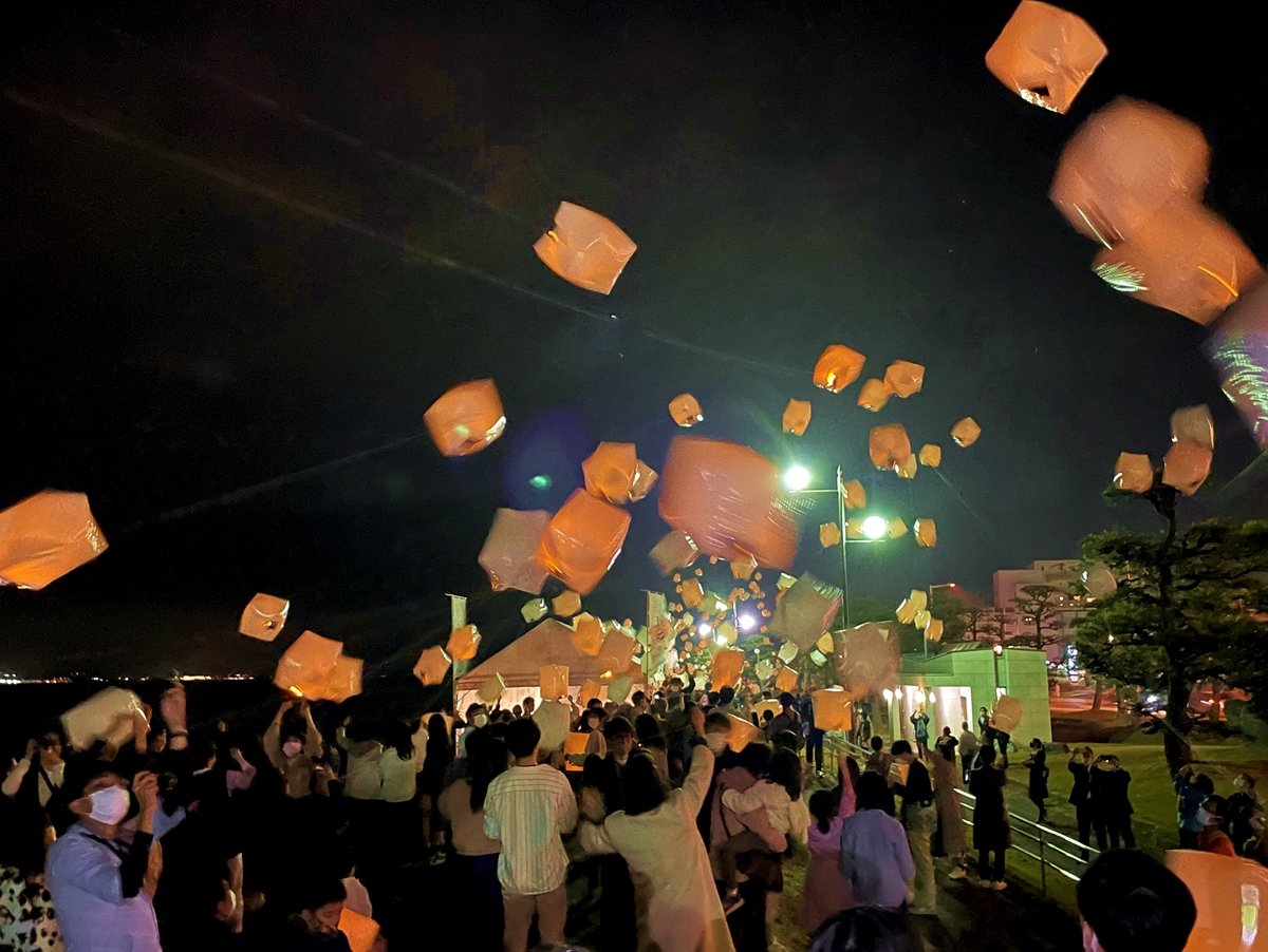 松江しんじ湖温泉の開湯50周年を記念した「縁結びスカイランタンフェスティバル」が23日夜、松江市千鳥町の宍道湖岸であった。市民や宿泊客500人が一斉にランタンを空に放ち、幻想的な光が湖岸を彩った。