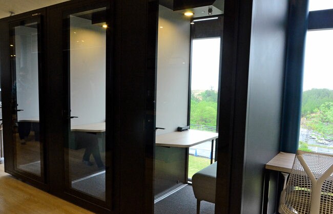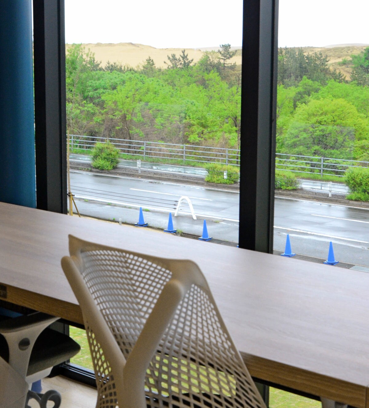 会員向けの2階からは砂丘や多鯰ケ池(たねがいけ)が望める。24時間営業で机や椅子、ソファをしつらえた。リモートワークなどを想定する個室は6室ある。非会員は45分500円、個人会員は月額5千~3万円、法人会員は同7万~30万円で貸し出しす。
