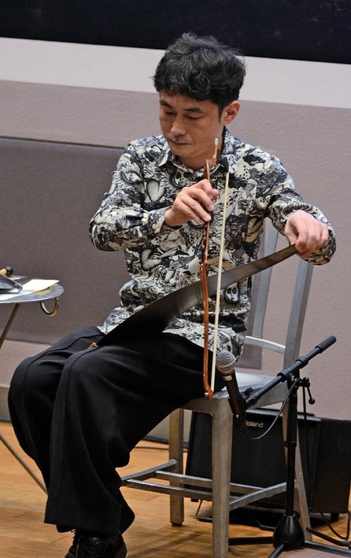 ミュージカルソーは演奏用のこぎりで、弓でこすって鳴らす。のこぎりの持ち手を膝ではさんで固定し、刃をS字形に曲げて奏で、曲げ具合で音程を変える。