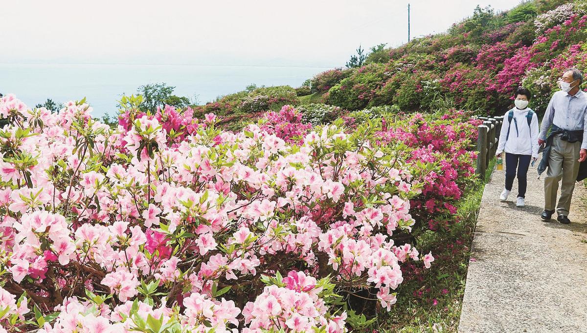 【松江】松江市美保関町美保関の五本松公園で、5千本のツツジが見頃を迎えた。2日は、多くの観光客らがカメラを片手に散策。鮮やかに咲き誇る赤や淡いピンク、白色の花が、多くの人を楽しませている。