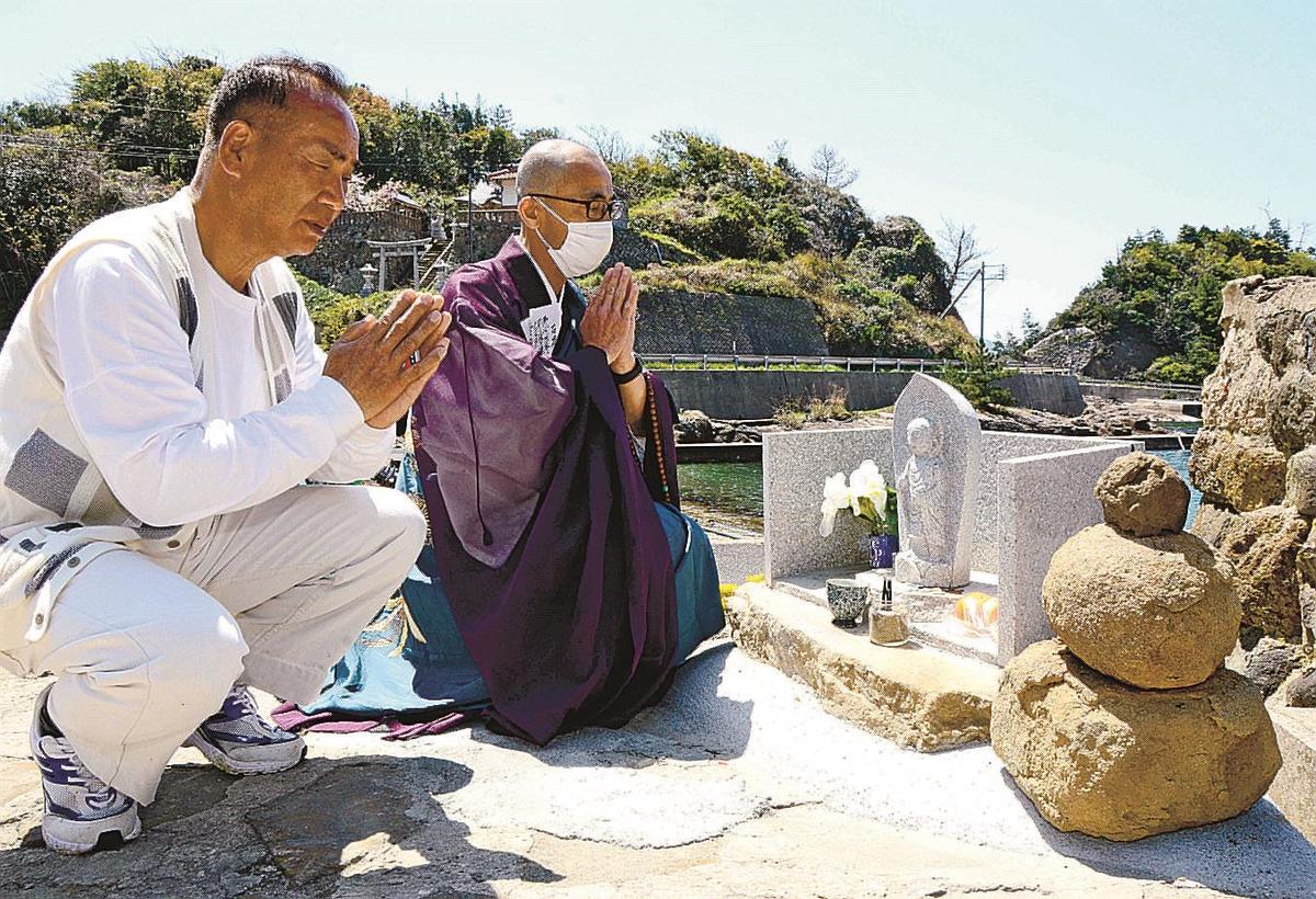 五輪塔があるのは港周辺の民家のそば。近くで育った若松さんも子どもの頃に祖父母からいわれを聞いており、「先人の供養と地域の歴史を残したい」と一念発起。塔を地蔵に改めようと、知り合いの石材店や左官の協力を得て設置にこぎ着けた。