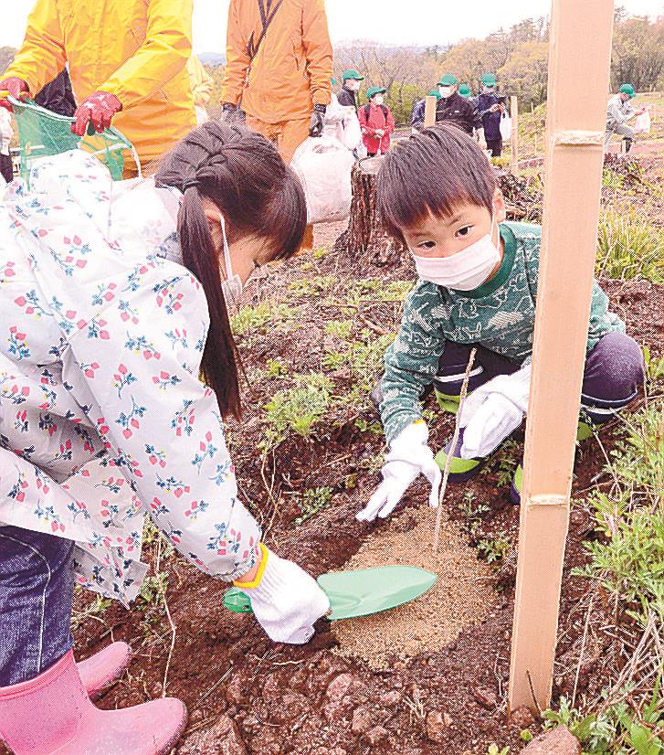 約40日後に迫った「第71回全国植樹祭」(5月30日)の会場となる国立公園・三瓶山麓(大田市)で17日、記念植樹イベントがあった。島根県内各地から参加した約500人がヤマザクラ、クルミ、クヌギの苗木を植え、新型コロナウイルスの影響で1年延期となった植樹祭の成功を願った。