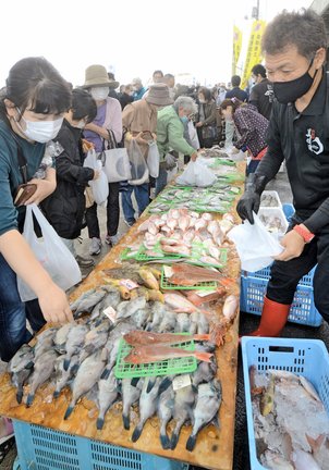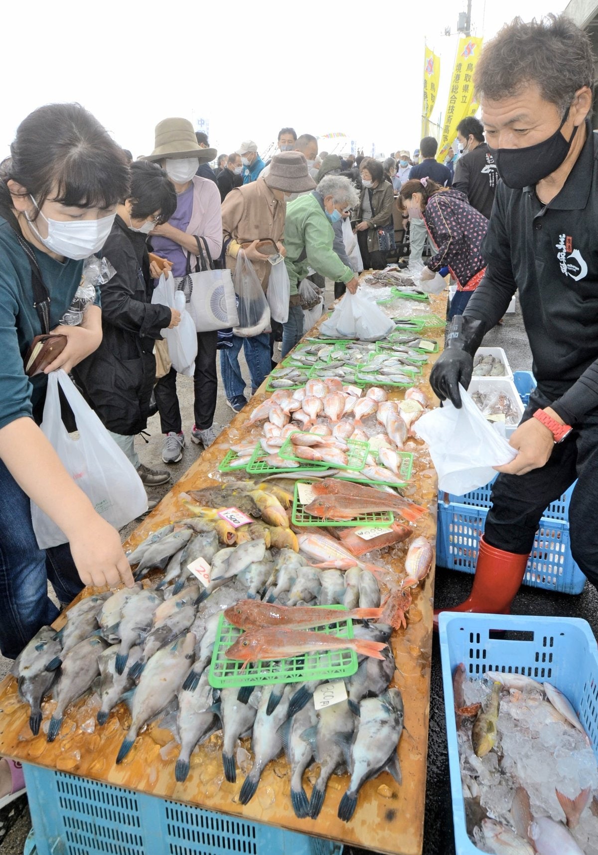 【境港】境港市の沿岸漁業者の拠点港の1つ、中野港(同市中野町)で14日、「さかいみなと中野港漁村市」が3年ぶりに開かれ、美保湾の鮮魚などを求めて集まった市民らでにぎわった。