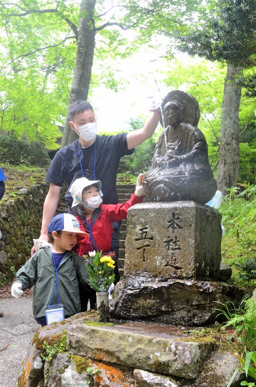 大山寺周辺にある200体以上の地蔵のうち、同中央会が子どもたちに親しんでもらおうと愛称を付けた6体を掃除した。子どもたちが地蔵に水をかけ、たわしで丁寧にこすって汚れを落とし、手を合わせた。