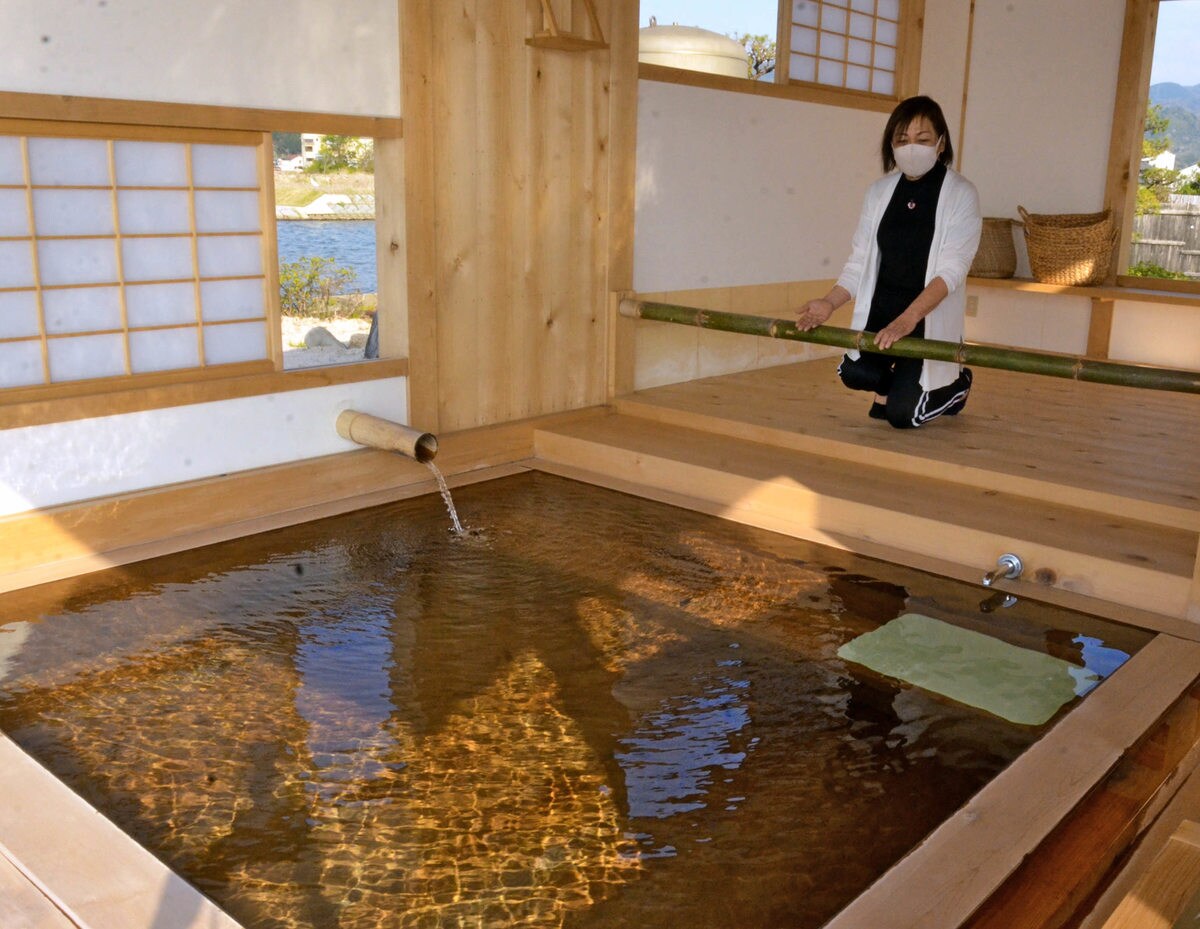 2021年10月に着工し、今年4月中旬にリニューアルオープンした。浴槽は殺菌効果があるとされるアスナロ材を使い、広さは従来の約3倍。竹筒の湯口や温泉の神を祭る棚も再現した。湯面と湖が一体化したような風景が楽しめる。