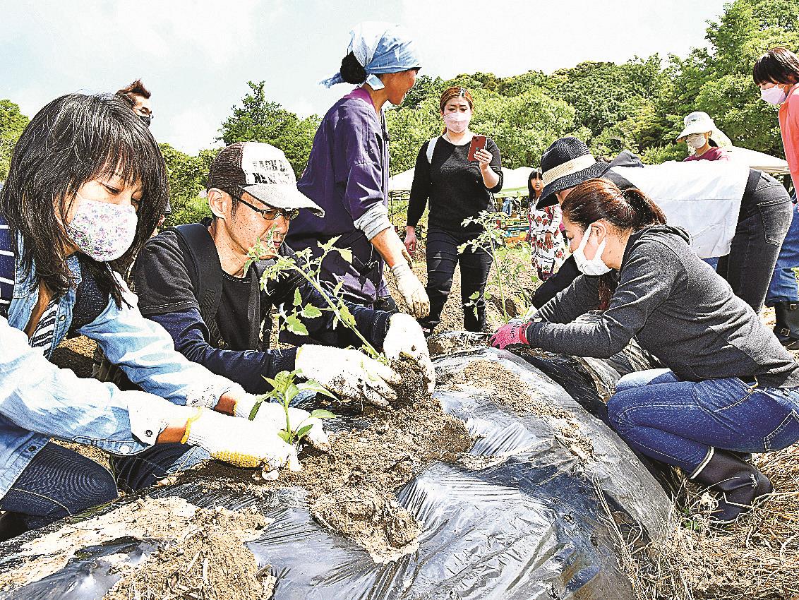 この日は、ナオファームの深町直子代表(49)が「無肥料栽培に有用な糸状菌(カビ)の餌になる」と、木や枯れ葉などを敷きビニールシートで覆う土作りを伝授。参加者は有機農業の土の感触を確かめるように、ミニトマトなど夏野菜6種類の苗植えを体験した。