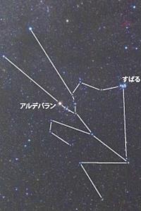 アルデバランは牛の目にあたり、その星を含(ふく)めてV字形に星が並(なら)んでいるところが牛の頭にあたります。そこから二つの星に向かって一本ずつ角(つの)が生えていて、いかにも立(りっ)派(ぱ)な牛の姿(すがた)に見えます。体の部分には、日本では「すばる」と呼(よ)ばれている星の集まりもあるため、おうし座はかなり目立ち、たとえオリオン座がなくても見つけやすい星座です。