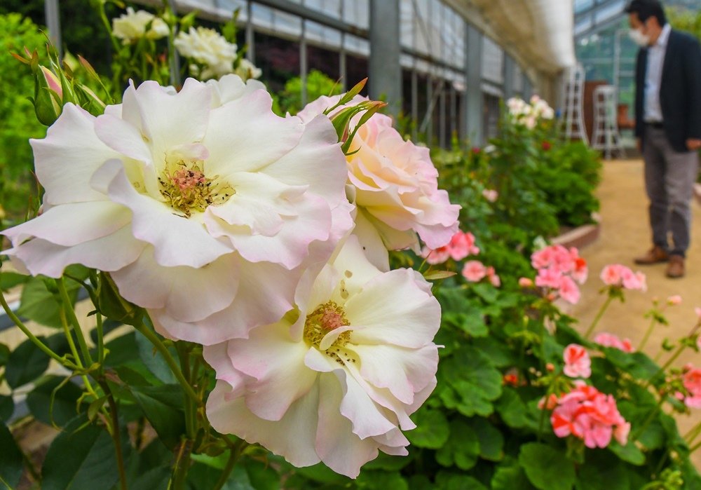 20日現在、白と淡いピンクの「マチルダ」や薄い黄色の「バレンシア」が見頃を迎えている。少しピークを過ぎたが、高さ2メートルの位置に濃いピンクの花をつける「ロザリューム・ウッテンセン」なども楽しめる。