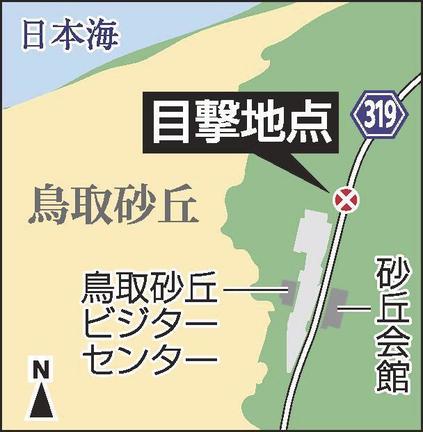 17日午後6時55分ごろ、鳥取市福部町湯山の県道でクマ1頭が車道を横切ったのを車で県道を走行中の男性が目撃した。現場は、鳥取砂丘近くの「砂丘会館」から北へ約200メートル。鳥取県、市職員が18日に現地を見回るなどして注意を呼び掛けた。