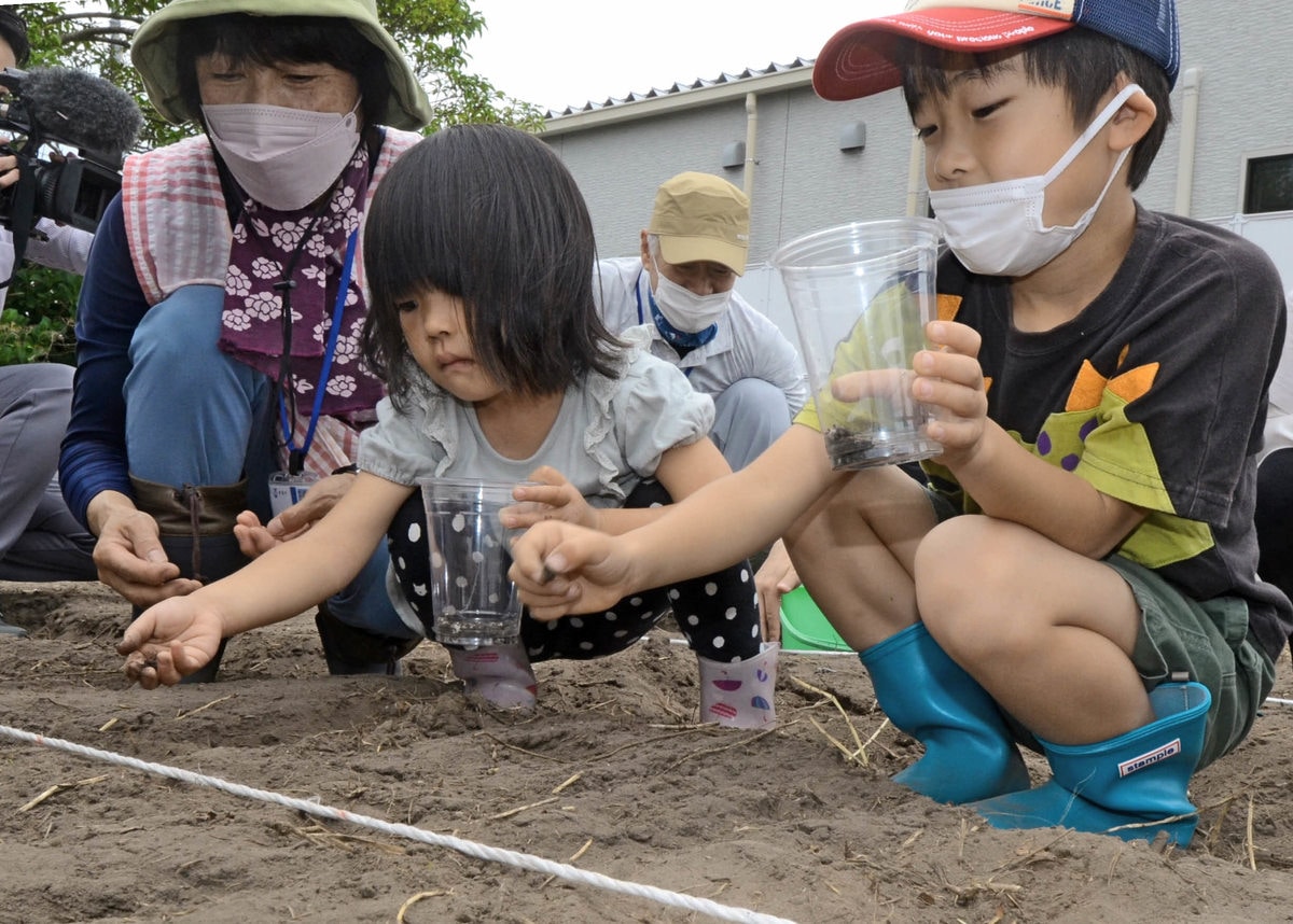 2011年度に始まったおくるみ贈呈に合わせた種まき企画に、今年は0~6歳児と保護者計10人が参加。伯州綿の栽培やPRに取り組む地域おこし協力隊員の手ほどきで、約30センチ間隔に種を3~5粒ずつまいた。同市立あがりみち保育園の江尻理沙ちゃん(3)は「楽しかった」と笑顔を見せ、秋の収穫を楽しみにした。