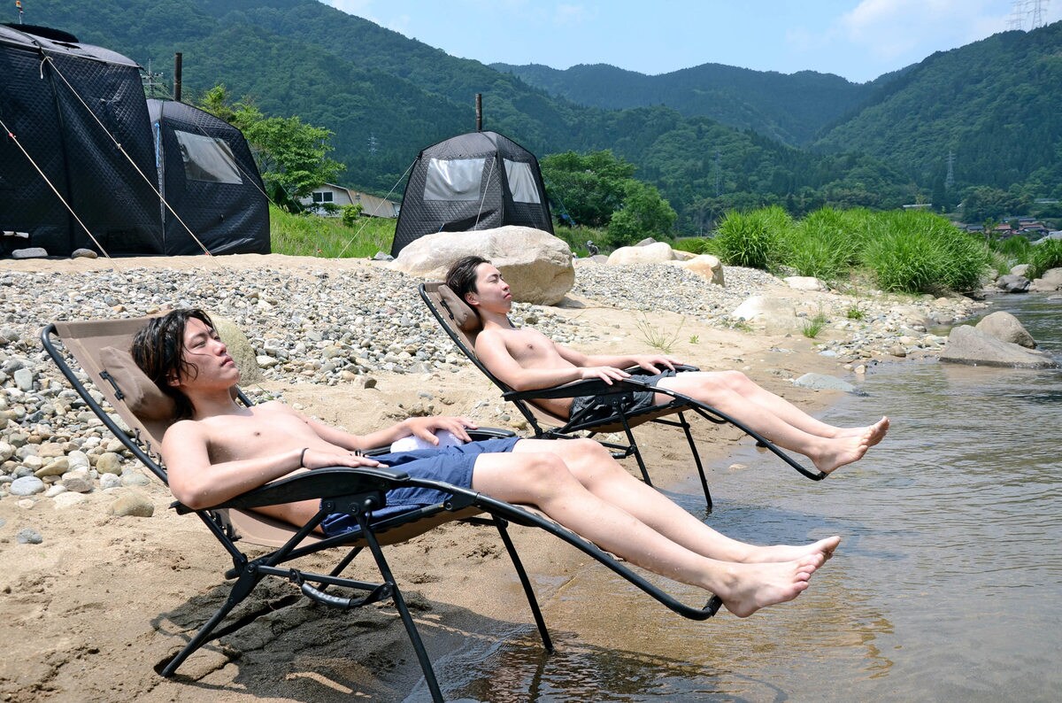 自然の中でサウナを楽しむイベントが22日、鳥取県日野町安原の日野川河川敷であった。県内外から訪れた25人が、移動可能なテント型サウナで汗を流し、川の水や初夏の風を浴びて過ごした。