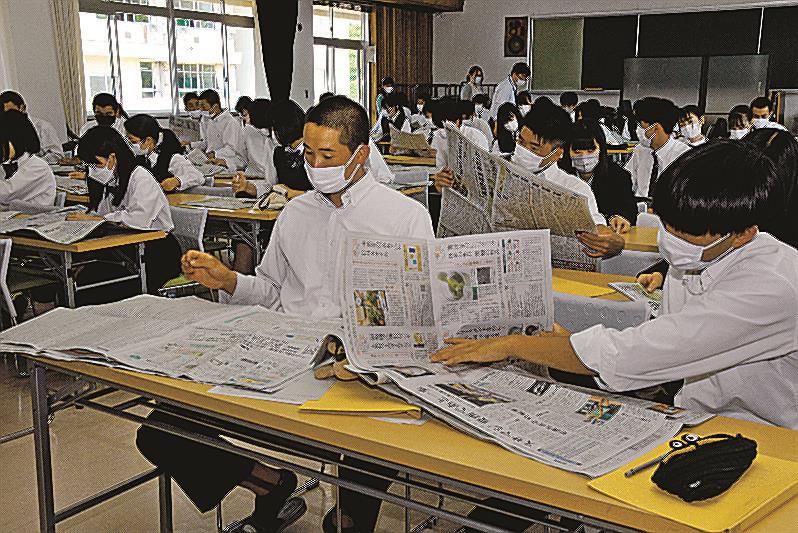 江津高は指定校2年目。全学年が年間を通じて新聞を取り入れた学習を行う。