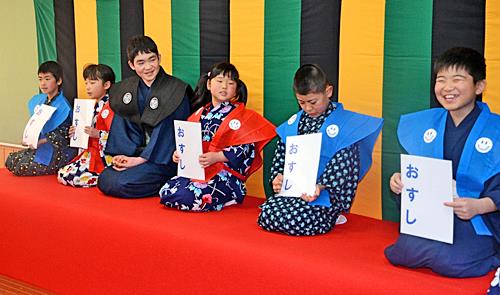 授(じゅ)業(ぎょう)の一(いっ)環(かん)で落語を学ぶ島根県奥(おく)出(いず)雲(も)町高(たか)尾(お)の高尾小学校で3月9日、卒業する6年生一人を送り出す「にこにこ寄(よ)席(せ)」が開かれました。総(そう)仕上げとして、卒業生の「青(あお)葉(ば)亭(てい)おすし」こと藤(ふじ)田(た)康(こう)佑(すけ)君(12)が高(こう)座(ざ)に上がり、得意の相撲(すもう)にちなんだ落語を披(ひ)露(ろう)すると、保(ほ)護(ご)者(しゃ)や町民らの笑いに包まれました。