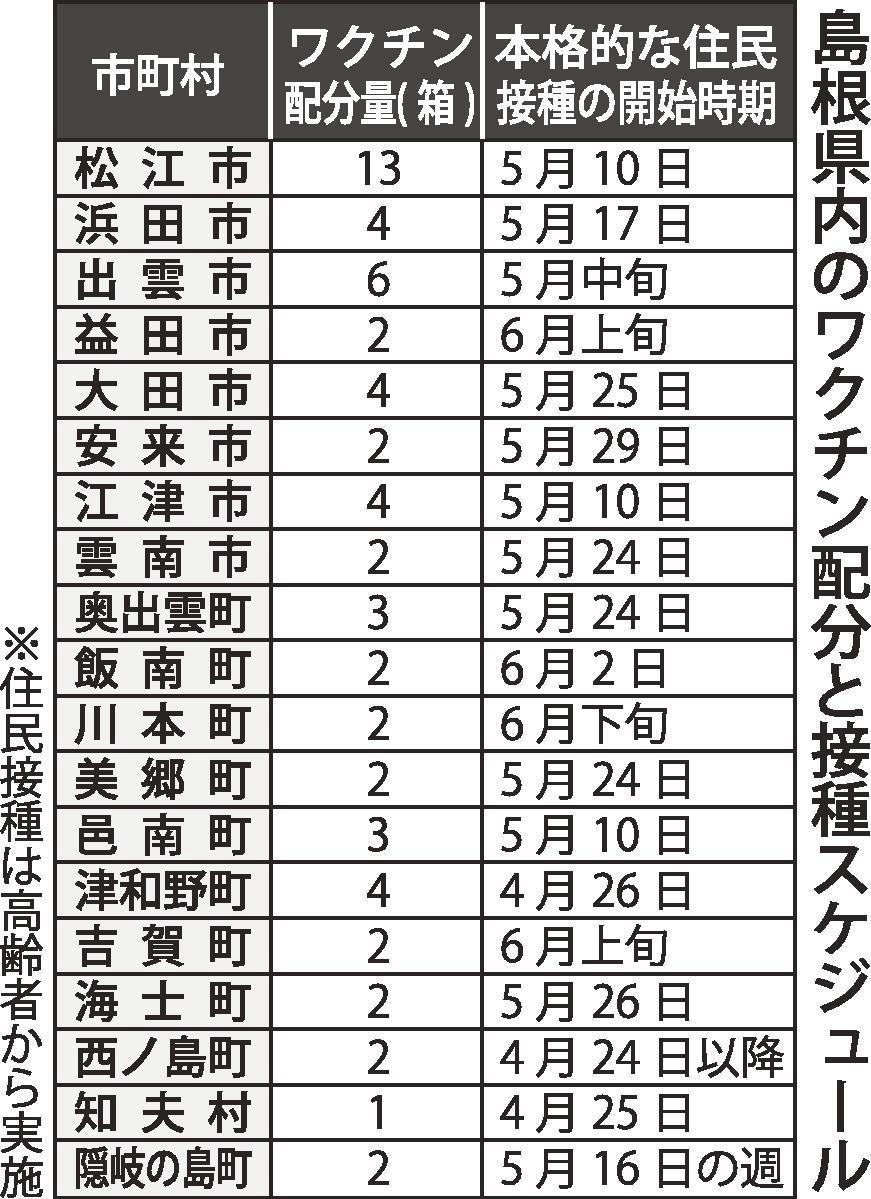 ワクチンの配分は松江市13箱、浜田市4箱、出雲市6箱など。高齢者施設入所者を対象とした先行接種を除く在宅の高齢者など、本格的な住民接種の時期は、松江市が5月10日、浜田市が同17日、出雲市が同中旬を見込む。知夫村は16歳以上の希望者を対象に4月25日に始める。