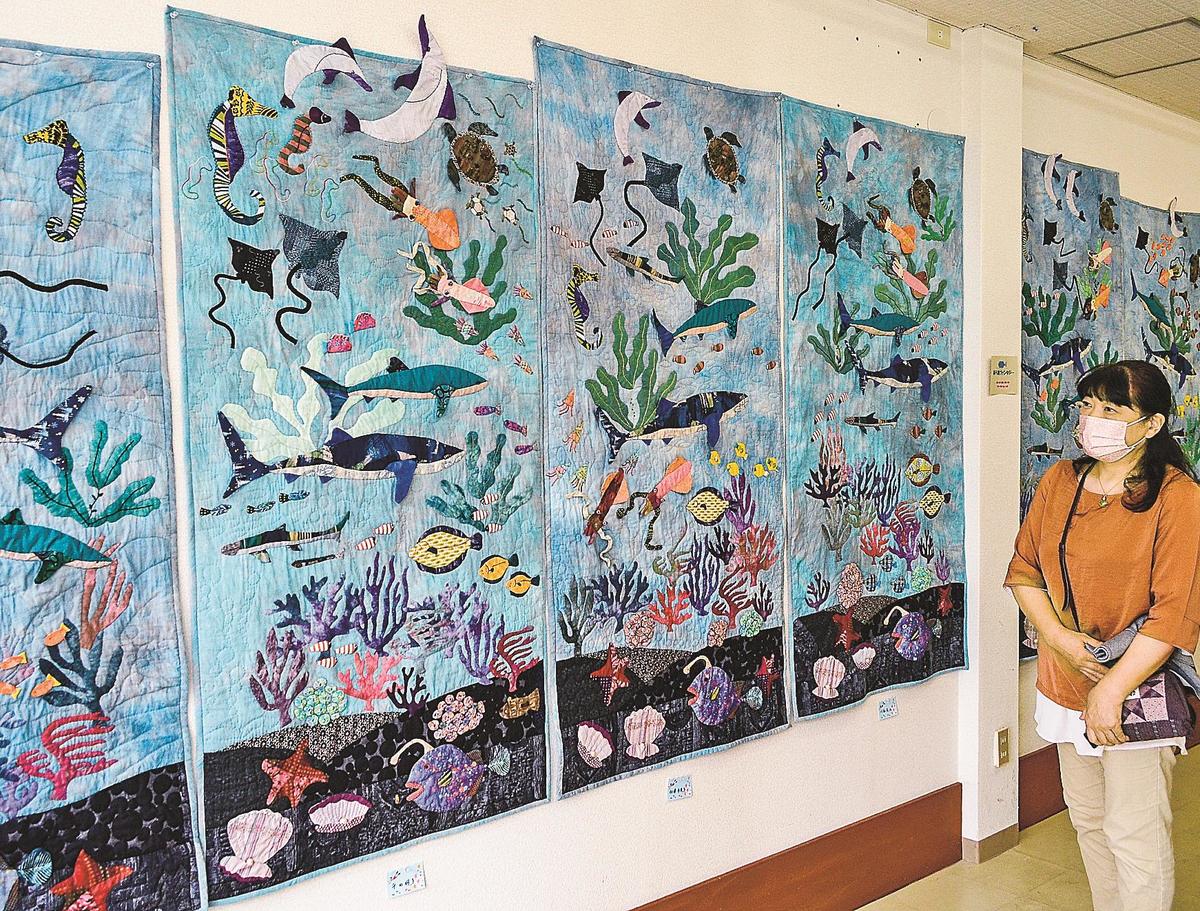 沖縄美(ちゅ)ら海水族館(沖縄県本部町)の水槽をイメージしたパッチワーク作品「美ら海ファンタジー」は縦1・8メートル、横7メートルの大作。会員9人の合作で、サメやイルカ、サンゴなどが海中で自由に過ごす様子を表現した。機織りやボタンネックレス製作などの体験会もある。