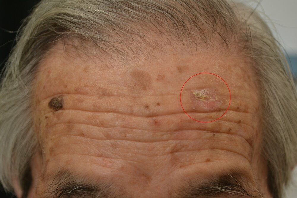 日光角化症は日光が多く当たった箇所に数ミリから2センチほどの、周囲に赤みを帯びたかさぶた状の物ができる。この段階では危険性が低いが、より危険な有棘細胞がんに移行する可能性があるという。