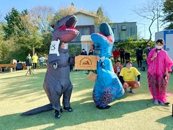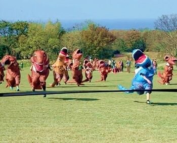 レースは4月16日、2ヘクタールの芝生を備えるグランピング施設「トマシバ」で開催した。各自で持参した市販の恐竜着ぐるみを着て約70メートルを競走するという、改めて考えても訳が分からないレースだ。ただ、100体の恐竜が風で頭を傾け、時に転びながら走り抜けるシュールな光景がネットを通して大きな注目を集めた。