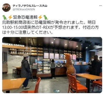 とにかく「面白いこと」が大好きな川本さん。レースのPRと参加者募集のため、自身が恐竜の着ぐるみを着て鳥取県と大阪府の各地を回るという「暴挙」に出た。週末を中心にスターバックスやイオンなど人が集まる場所に出向き、SNSで自身を見た人と思われる投稿を探し、拡散したという。