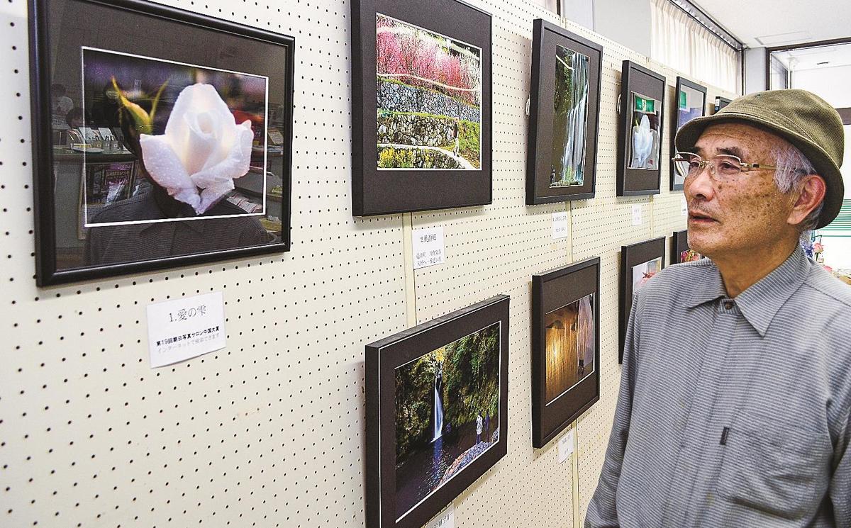 大賞作品「愛の雫」は自宅の庭に咲く白いバラの美しさを巧みに表現した。明け方の真っ青な空と霧のかかった斐伊川、モノクロで雲と橋を強調した山口県の角島大橋など四季折々の自然の美しさが目を引く。