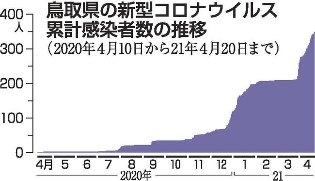 鳥取県内で新型コロナウイルスの感染が急拡大している。約1カ月ぶりに感染者が確認された3月24日から4月20日までの1カ月足らずの間に四つのクラスター(感染者集団)が発生し、新規感染者は140人に上る。この「第4波」は感染者が急増する関西に近く、感染力の強い変異株が入り込んだのが一因。県は、家庭内や職場内でもマスクを着けるなど感染予防策をさらに強めるよう、県民に呼び掛けている。