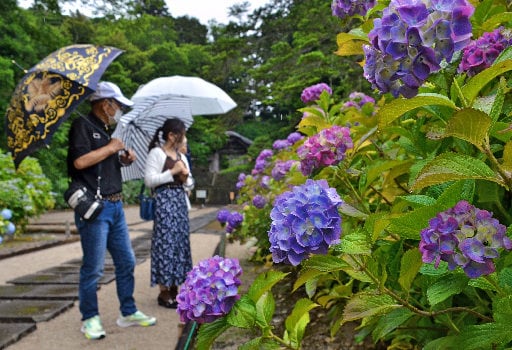 同気象台によると、山陰両県は14日、西日本にかけて停滞する前線の影響で曇りや雨となった。アジサイの名所として知られる松江市外中原町の月照寺では、訪れた人が雨にぬれた青、白、紫などの大輪を眺めて季節を感じ取っていた。