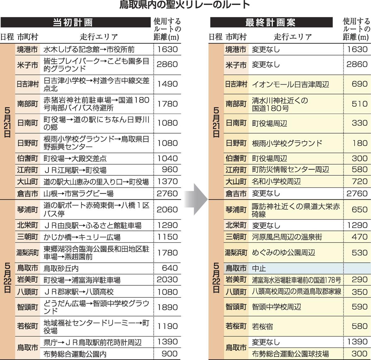 最終案は、鳥取砂丘(鳥取市)内を除外するなど、感染防止対策や警備が難しい場所を避けて見直し。県内19市町村で使用するルートの距離は、当初の31・45キロから17キロに縮まった。
