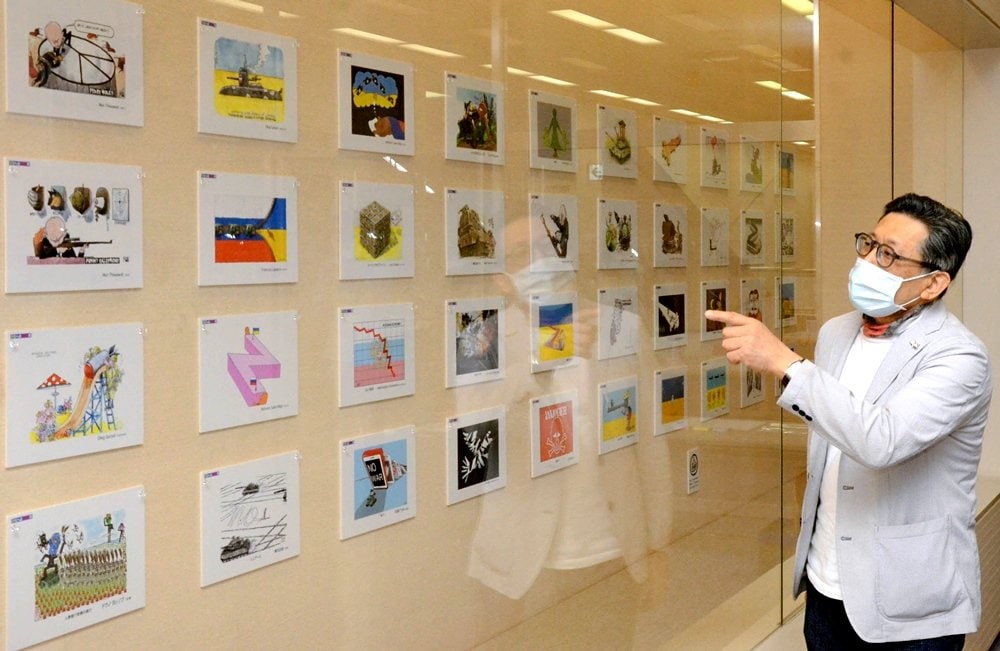 平和を訴える一こま漫画を集めた国際平和漫画展が1日、鳥取市尚徳町の県立図書館で始まった。13カ国の漫画家49人の130点を展示し、反戦や平和を願うメッセージが込められている。13日までで、続いて米子と倉吉両市を巡回する。観覧無料。