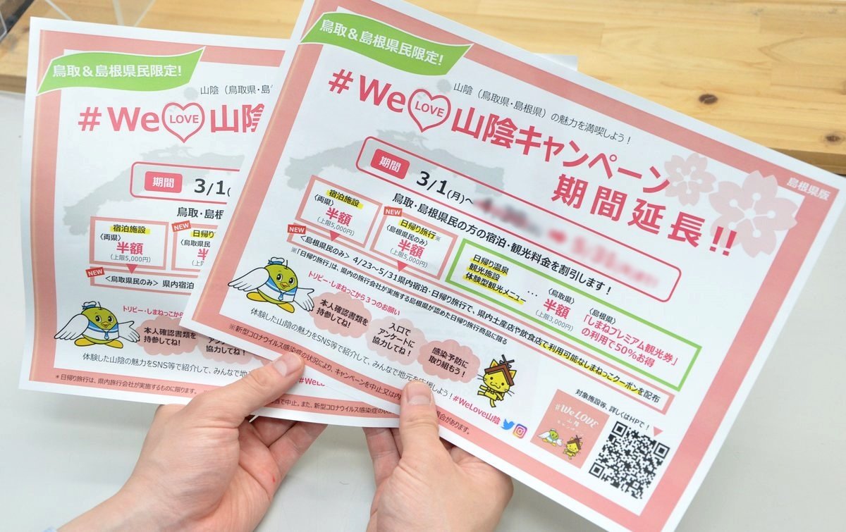 島根県が14日、県内宿泊施設や旅行商品の料金割引が受けられる「WeLove(ウィーラブ)山陰キャンペーン」「再発見!あなたのしまねキャンペーン」の期間を8月31日宿泊分まで延長すると発表した。中四国各県民が対象で、新型コロナウイルスワクチンの接種証明書を施設で提示する必要がある。
