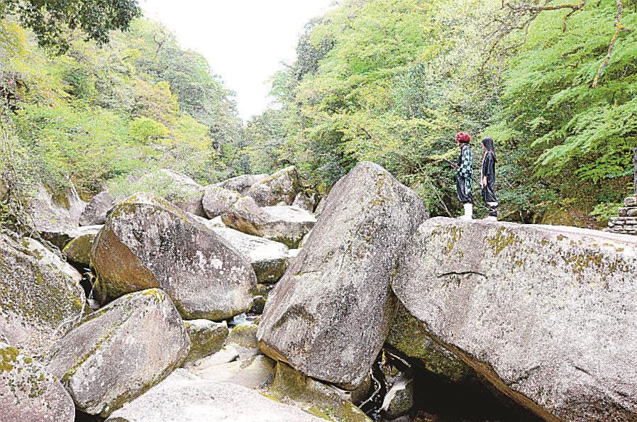 鬼の舌震は、斐伊川の支流・大馬木川の流域約2キロにわたって広がるV字形の渓谷。人気アニメ「鬼滅の刃」で、主人公・竈門(かまど)炭治郎(たんじろう)が剣技の修行で真っ二つにした岩に似ているとして話題を呼んだ「鬼の試刀岩」が、ファンの注目を集める。