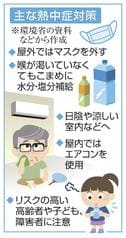 全国では体育の授業中に児童が熱中症で搬送されるケースがあった。文部科学省は体育の授業ではマスクを外すことを呼びかけ、山田准教授も「屋外、特に運動をする時はマスクを外した方がよい」と支持する。山陰両県で増加する新型コロナウイルス感染を防ぐためにマスクは有効だが「マスクはその場の環境に応じて適切な着け方をしていく必要がある」と話した。厚生労働省も屋外では人との距離(2メートル以上を目安)が確保できる場合や距離が確保できなくても会話をほとんど行わない場合はマスクをする必要はないとし、熱中症の防止を呼びかけている。
