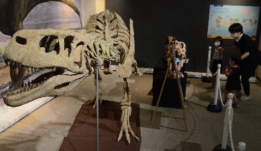 恐竜の全身骨格標本や貴重な化石を展示する特別企画展「恐竜の世界へ行ってみた」が16日、大田市三瓶町の島根県立三瓶自然館サヒメルで開幕した。初日から大勢の家族連れが迫力満点の標本に見入り、恐竜が生きた時代の環境変化について考えた。9月25日まで。